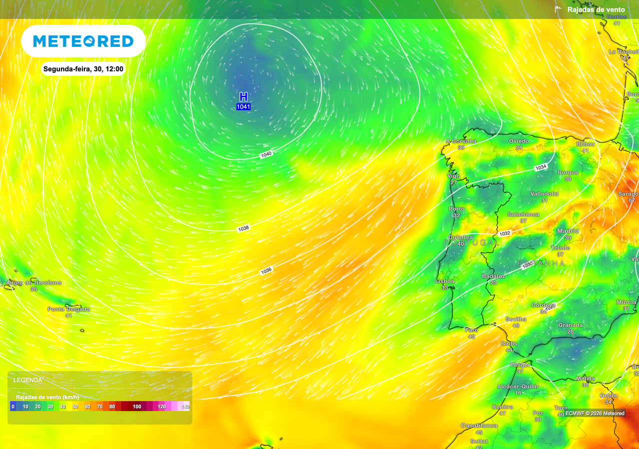 Entre 29 e 31 de março, Portugal continental estará sob a influência de um anticiclone notavelmente intenso. Centrado no Atlântico Nordeste, a oeste da Península Ibérica, este sistema de altas pressões apresenta valores que se estimam entre 1038 e 1042 hPa. Esta magnitude é considerada invulgar para o final de março, configurando um regime de bloqueio atmosférico. Tal regime resulta do reforço de uma crista anticiclónica em altitude, que, por sua vez, induz um fenómeno de subsidência. A subsidência corresponde ao movimento descendente do ar, uma condição que, ao comprimir e aquecer o ar, dificulta significativamente a formação de nuvens e, consequentemente, a ocorrência de qualquer tipo de precipitação relevante. Esta configuração assegura, portanto, uma estabilidade atmosférica prolongada ao longo de vários dias consecutivos, garantindo um período de tempo seco e predominantemente ensolarado em grande parte do território nacional. A ausência de sistemas frontais será a tónica dominante.