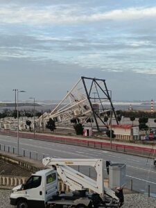 A passagem da depressão Kristin durante a madrugada desta quarta-feira, 28 de janeiro, deixou um rasto de destruição sem precedentes na Figueira da Foz. O incidente mais emblemático ocorreu no Parque das Gaivotas, onde a Roda Gigante instalada na marginal não resistiu às rajadas de vento extremas e colapsou totalmente.