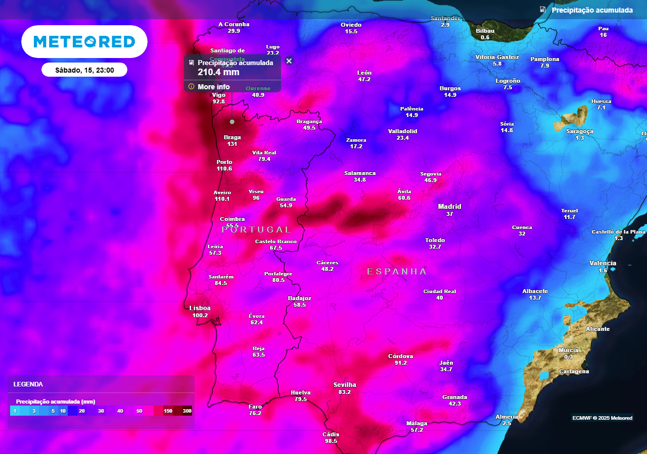 Em termos de precipitação acumulada entre quinta e sábado, os valores deverão ser consideráveis em várias regiões. No litoral norte, Viana do Castelo poderá ultrapassar os 190 mm, enquanto Braga deverá registar valores acima dos 120 mm. Na Grande Lisboa e Península de Setúbal, os acumulados deverão variar entre 100 mm e 120 mm. Na Covilhã e nas zonas montanhosas da Beira Interior, são esperados valores próximos dos 120 mm.