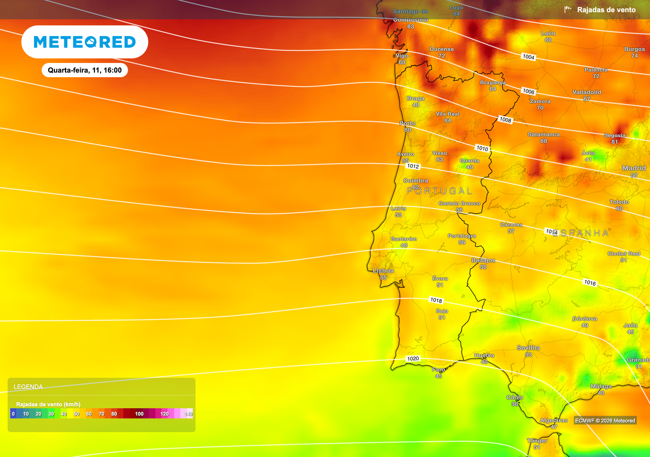 Na quarta-feira, dia 11 de fevereiro, a precipitação deverá persistir, embora mais sob a forma de aguaceiros frequentes e menos organizada. Contudo, será o vento que se destacará, com uma intensificação notável da circulação de oeste. Espera-se vento moderado a forte no litoral e nas terras altas, onde as rajadas poderão atingir velocidades entre 70 e 90 quilómetros por hora (km/h). Estas condições de vento forte poderão afetar o trânsito rodoviário, especialmente em zonas expostas, e exigir cautela acrescida nas atividades ao ar livre, dada a possibilidade de queda de árvores ou de outros objetos soltos.