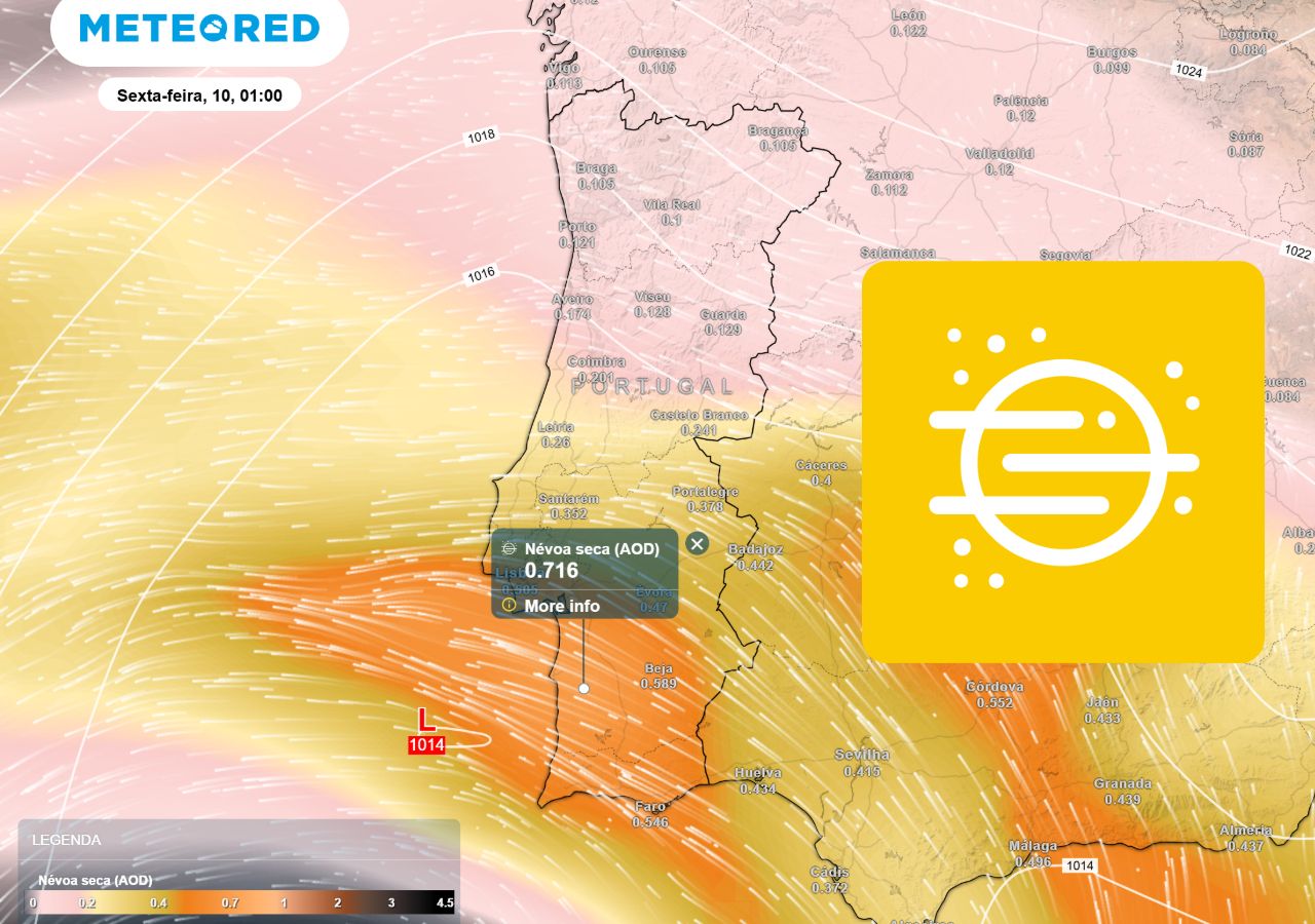 Ainda que a presença desta depressão seja o fator determinante para a chegada das poeiras, a sua própria dinâmica poderá proporcionar uma breve interrupção neste fenómeno. De acordo com as análises meteorológicas mais recentes, o efeito giratório do sistema depressionário poderá, temporariamente, afastar as poeiras do continente durante algumas horas entre terça e quarta-feira. Contudo, esta trégua será efémera e localizada, não representando o fim do evento. À medida que o centro desta depressão se move e se aproxima do continente africano, o fluxo de ar inverter-se-á ou ajustar-se-á, permitindo que as poeiras regressem ao país com uma concentração ainda maior. Esta intensificação é particularmente esperada já nas primeiras horas da madrugada de quinta-feira, dia 9, assinalando uma nova fase mais intensa deste evento de intrusão. Para o dia de hoje, segunda-feira, a concentração das poeiras será mais notória e densa nas regiões do Sul, estendendo-se progressivamente para o Centro. No restante território continental, as concentrações deverão ser mais baixas, embora a presença das partículas seja expectável em toda a geografia portuguesa, criando uma camada de névoa mais ou menos percetível dependendo da zona.