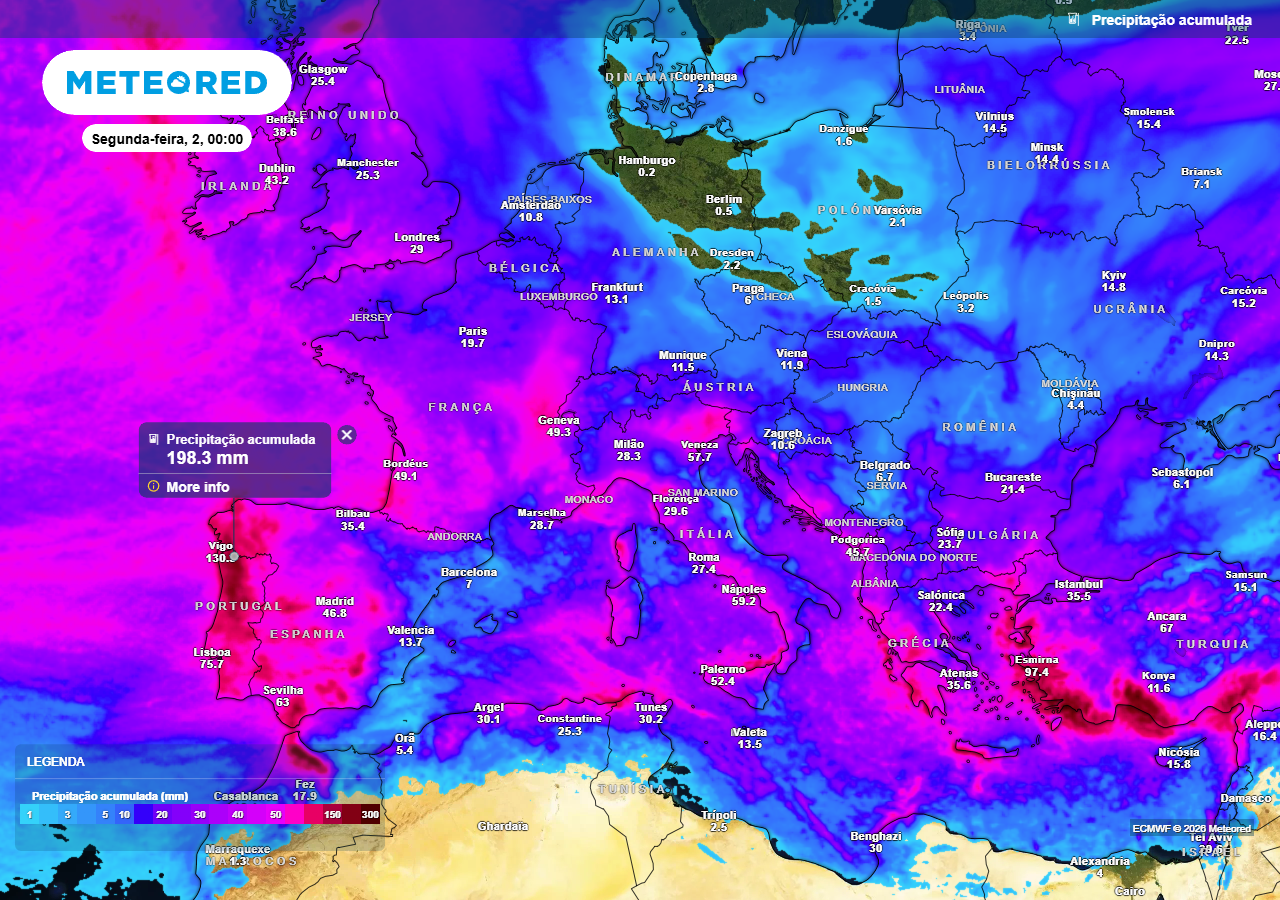 As acumulações de chuva serão particularmente elevadas no Noroeste de Portugal, tornando-o numa das regiões mais chuvosas de toda a Europa nos próximos dias. As últimas atualizações dos modelos europeus indicam valores a rondar os 200 mm nas zonas mais expostas das serras do Minho, Alto Tâmega e Barroso até à meia-noite de segunda-feira, 2 de fevereiro. Em vastas zonas dos distritos de Viana do Castelo, Braga e Vila Real, as acumulações poderão facilmente ultrapassar os 150-200 mm, com valores semelhantes ou ligeiramente inferiores previstos para grande parte dos distritos do Porto, Aveiro e Viseu. O Porto, em particular, poderá registar quase 20 mm de chuva em apenas seis horas, acompanhado de rajadas de até 130 km/h.