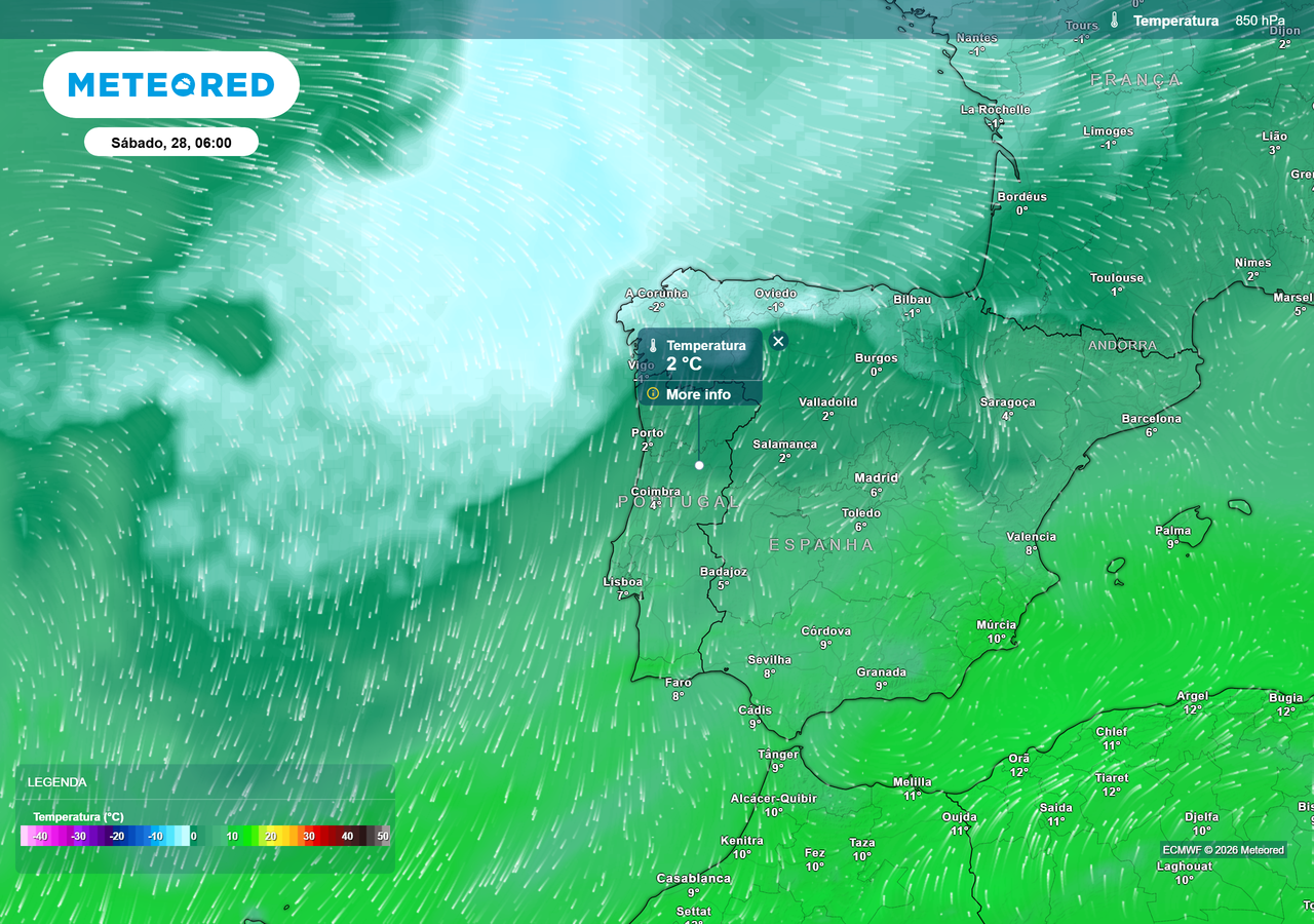 A influência desta massa de ar frio será mais sentida na madrugada de sábado, quando se prevê que vários pontos do Norte e Centro de Portugal continental possam registar valores negativos. Este cenário exige especial atenção, sobretudo em zonas de maior altitude ou de interior, onde a geada pode ser uma realidade. Contudo, durante o dia de sábado, embora de forma pouco significativa, já se poderá notar uma ligeira recuperação dos valores máximos. Esta tendência de recuperação deverá manter-se no domingo, oferecendo um pequeno alívio após o arrefecimento abrupto.
